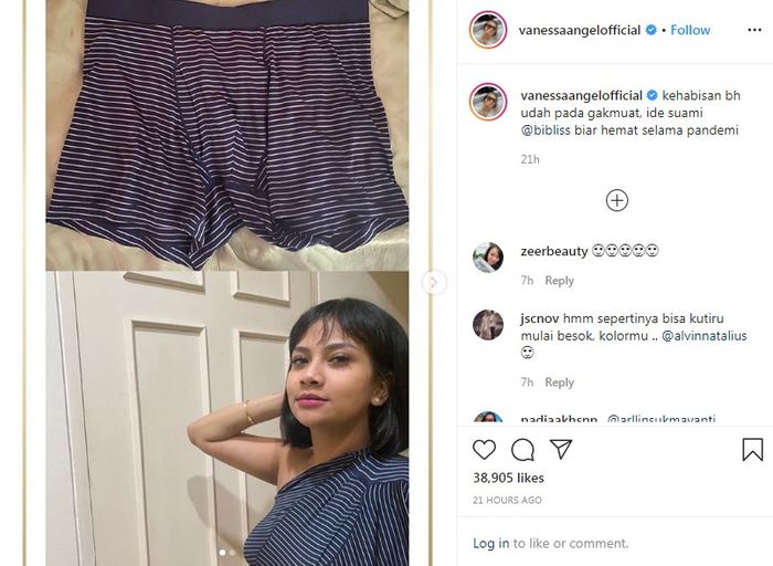 Pada postingan itu, Vanessa Angel memamerkan foto diri serta memamerkan celana boxer milik sang suami, Bibi Ardiansyah.