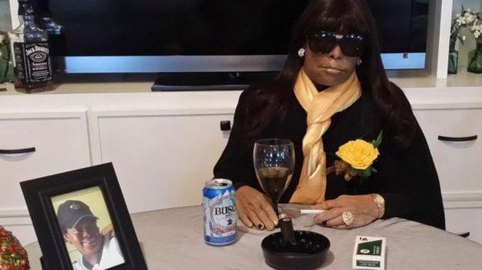 Sosialita dan filantropis New Orleans Mickey Easterling (83) yang telah meninggal disusun dengan pose segelas bubbly di satu tangan dan sebatang rokok di tangan lainnya.