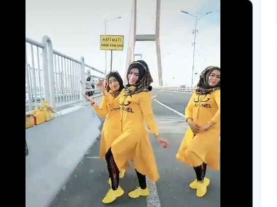 Mengenakan pakaian serba kuning, ketiga wanita tersebut menari sambil diiringi lagu India di ruas jalan Jembatan Suramadu. Video itu diketahui milik akun Tiktok @naylaraisa2003 yang diunggah dua hari lalu.