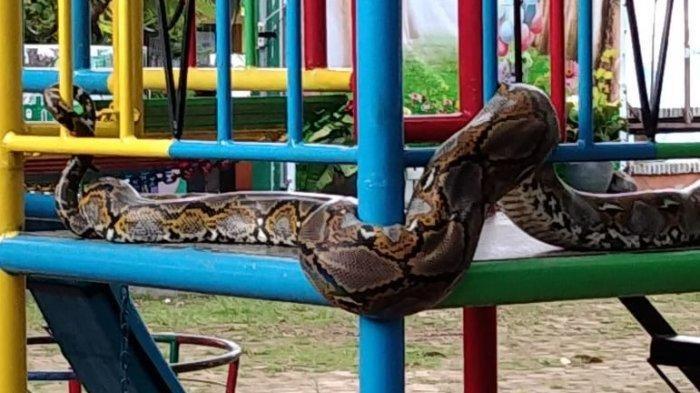 Saat didekati, ular Piton tersebut sempat naik ke wahana bermain anak.