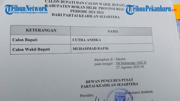 Adapun DPP PKS mengusung kader Hanura, Cutra Andika sebagai Bakal Calon Bupati Rokan Hilir dan Ketua DPD PKS Rohil, Muhammad Rafik sebagai Bakal Calon Wakil Bupati Rokan Hilir.