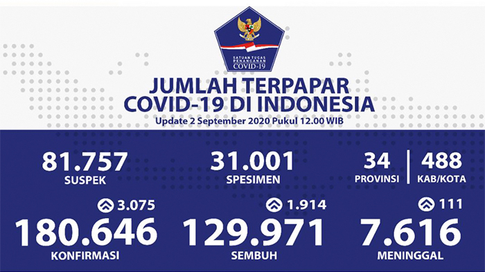 Sementara itu secara nasional, kasus kumulatif Covid-19 hari ini total 180.646 orang karena adanya penambahan jumlah pasien positif per hari ini sebanyak 3.075.