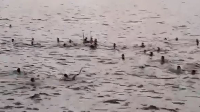 Dalam videonya, terlihat puluhan remaja berada di laut dekat dermaga.