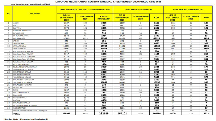 Kasus baru Positif Covid-19 hari ini tanggal 17 September 2020 ada sebanyak 225 kasus hingga totalnya menjadi 4462 kasus.