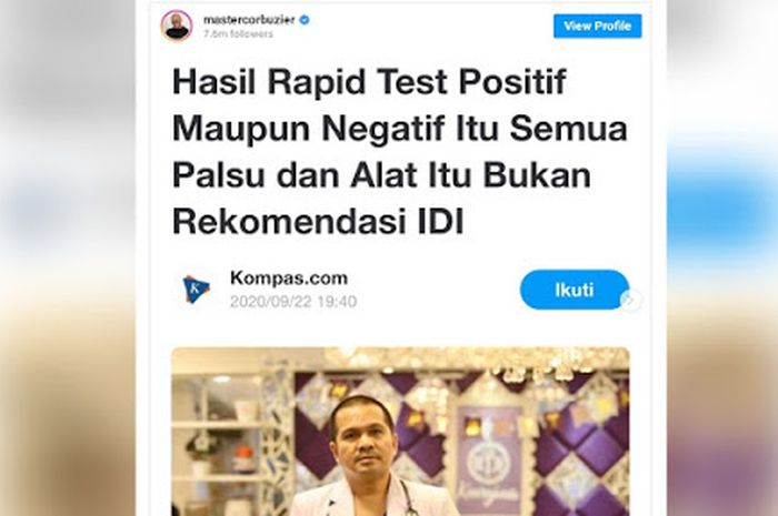 “Hasil rapid test positif maupun negatif itu semua palsu dan alat itu bukan rekomendasi IDI,” katanya saat dikonfirmasi, Senin (21/9/2020), dikutip dari Kompas.com.