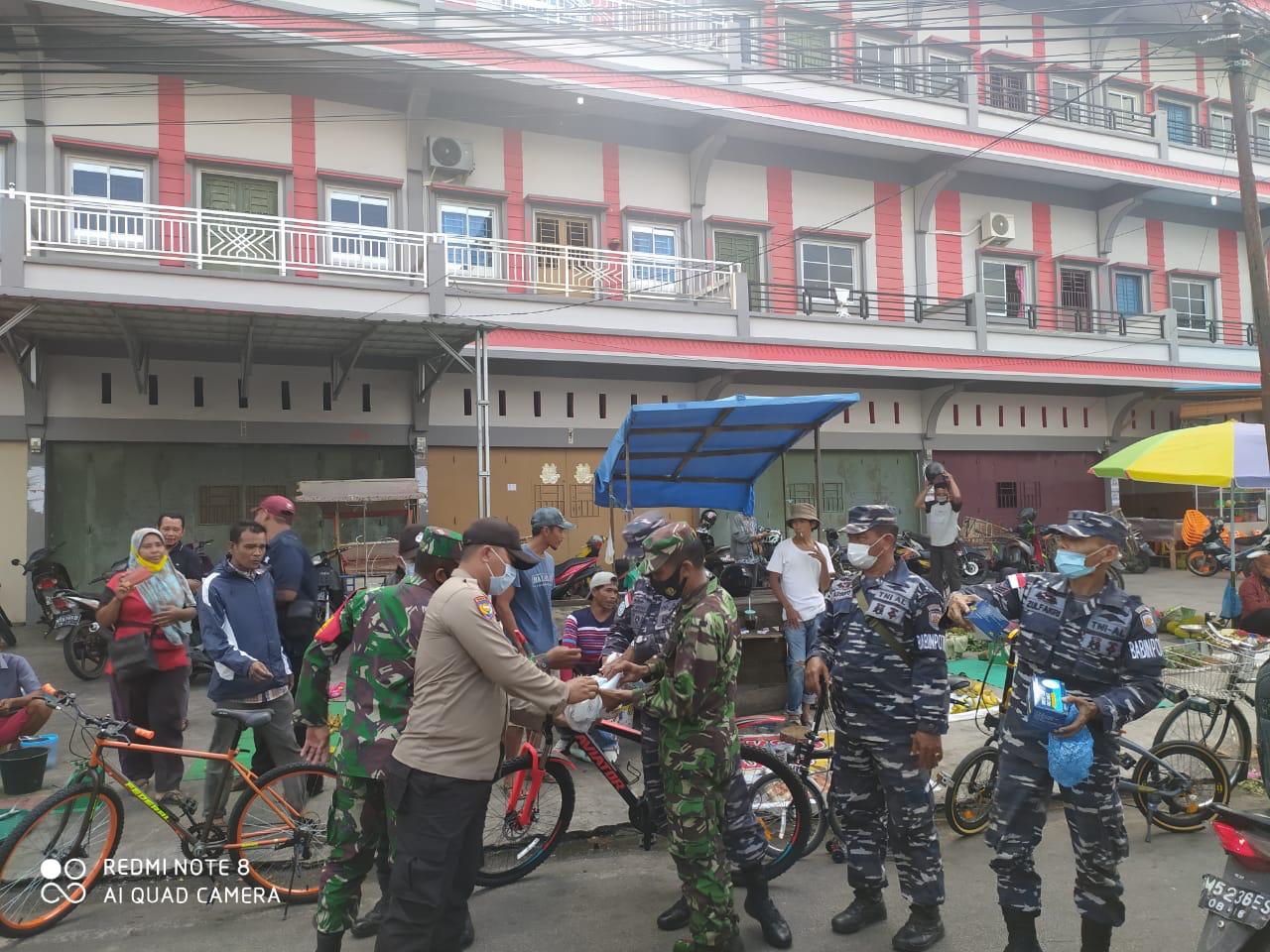 Foto: Danposal Selatpanjang Letda Laut Jerry Hendra bersama Babinpotmar Posal Selat Panjang, Koramil 02 Tebingtinggi dan Babinkamtibmas Polres Kepulauan Meranti bagikan masker kepada masyarakat di pasar Tumpah Imam Bonjol, Selatapanjang Jumat (13/11/2020).