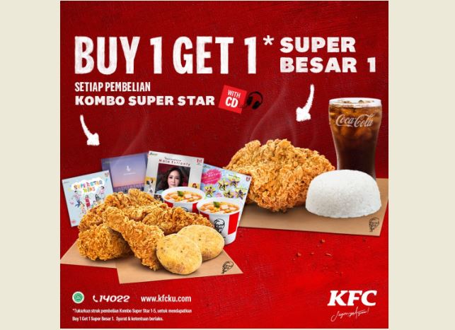 Buat kamu yang bingung mau makan apa siang nanti, KFC ada promo traktiran voucher BUY 1 GET 1 Super Besar dari KFC nih!