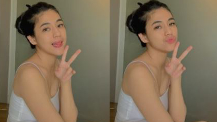 Dalam foto itu, Putri Una atau Dj Una berpose duduk di atas kasur memegang bantal bersarung putih, dan ia memakai tank top warna putih