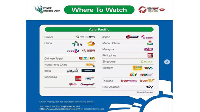 Thailand Open I 2021 juga bisa ditonton di TVRI Sports HD untuk siaran digital, serta UseeTV, Vidio, dan Champions TV untuk pelanggan tayangan berbayar.