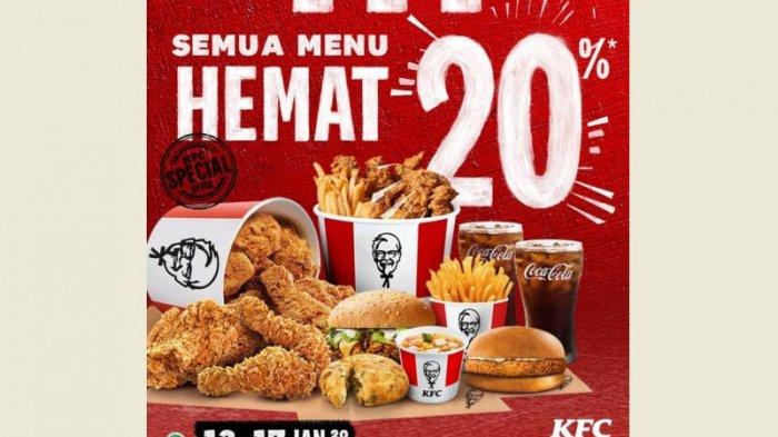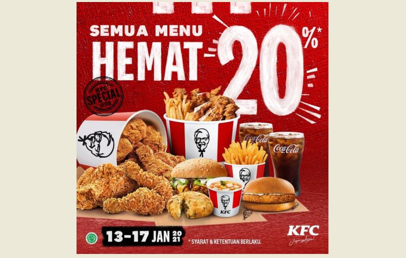 Diskon 20 persen promo KFC berlaku untuk semua menu ala carte dan combo, kecuali promo value. berlaku hingga 17 Januari 2021