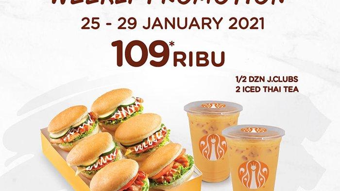 Weekly Promotion J.CO hingga 29 Januari 2021 adalah 1/2 lusin JCLUBS + 2 Iced Thai Tea dengan harga hanya Rp 109 Ribu