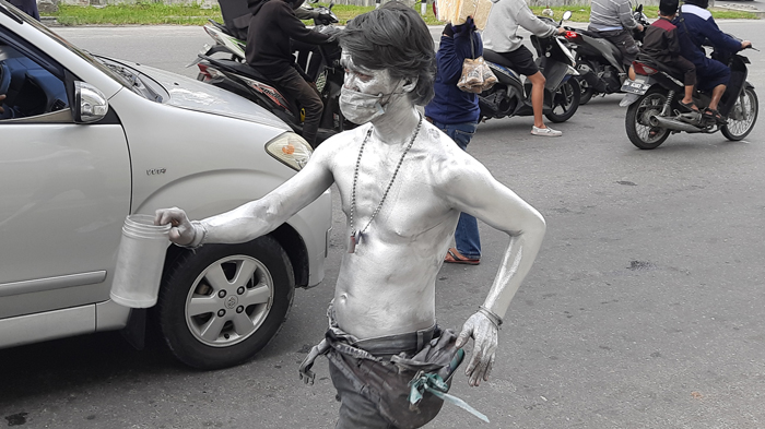 Demi Rupiah, Pria Asal Aceh Ini Rela Jadi Manusia Perak di Pekanbaru, Begini Kisahnya. Foto: Paing