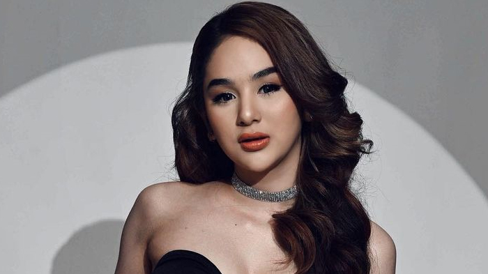 Hana Hanifah tampil dengan rambut ikal mayangnya yang digerai, sebagian dijuntai ke bahu kiri depan dan sebagian di dijuntai di punggungnya.