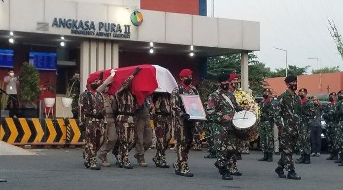 Upacara pengantar jenazah dipimpin langsung oleh Pangdam Jaya/Jayakarta Mayjen TNI Dudung Abdurahman diiringi tabuhan drum sebagai tanda penghormatan.