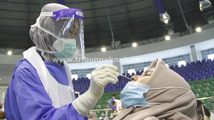 TRIBUNPEKANBARU.COM,PEKANBARU - Jelang kunjungan Jokowi ke Riau, sejumlah penerima vaksin menjalani rapid tes antigen di Gelanggang Remaja, Pekanbaru, Selasa (18/5/2021).