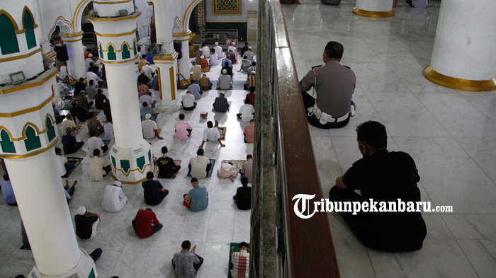 Warga Pekanbaru Sholat Jumat Pakai Masker di Masjid Agung Paripurna Ar Rahman, Ini yang Terjadi (Tribun Pekanbaru/Dodi Vladimir)