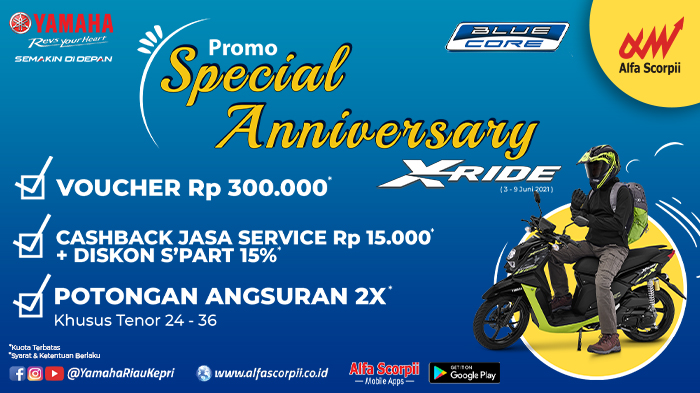 Main dealer PT Alfa scorpii melalui area marketing menjelaskan bahwa dalam rangka anniversary yamaha x-ride, maka bagi konsumen dalam setiap pembelian yamaha x-ride akan mendapatkan banyak hadiah promo spesial.
