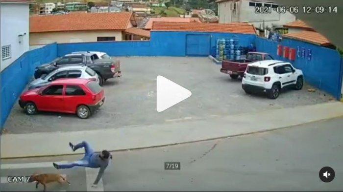 video viral seorang lelaki menyeberang jalan raya tertabrak seoekor anjing hingga jatuh terjungkal di jalan.