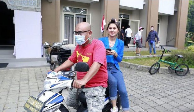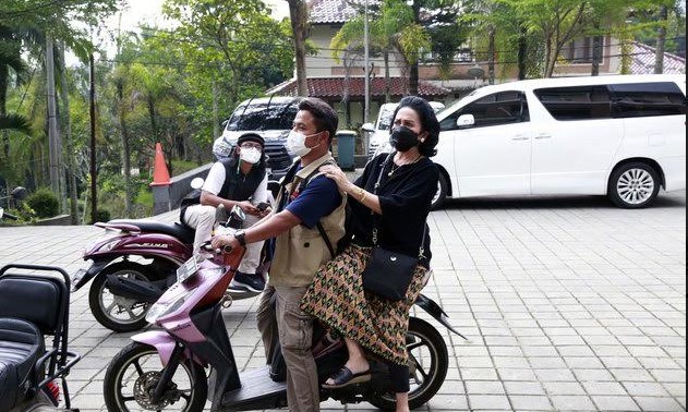 Meskipun dibonceng naik motor, Hana Saraswati masih tetap bisa tampil kece.