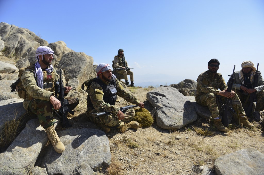 Gerakan perlawanan Afghanistan dan pasukan pemberontak anti-Taliban beristirahat saat mereka berpatroli di puncak bukit di daerah Darband di distrik Anaba, provinsi Panjshir pada 1 September 2021.