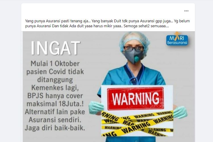 "Ingat mulai 1 Oktober pasien Covid tidak ditanggung Kemenkes lagi, BPJS hanya cover maksimal 18Juta.! Alternatif lain pake Asuransi sendiri. Jaga diri baik-baik," demikian narasi yang tertulis pada flyer tersebut.