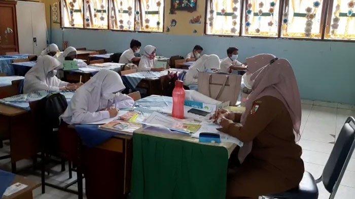 TRIBUNPEKANBARU.COM,PEKANBARU - Aktivitas belajar tatap muka di SMPN 44 Pekanbaru kembali digelar Kamis (23/9/2021) pasca salah satu guru terkonfirmasi positif Covid-19.