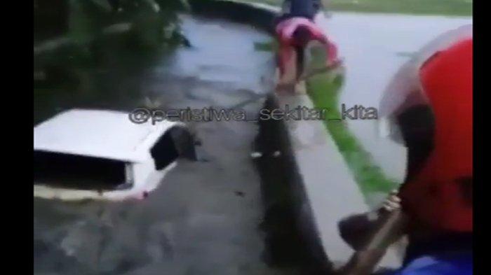 Kondisi selokan yang sedang penuh dengan aliran deras air itu membawa mobil terapung dan mengalir. Sejumlah warga terlihat berusaha menyelamatkan