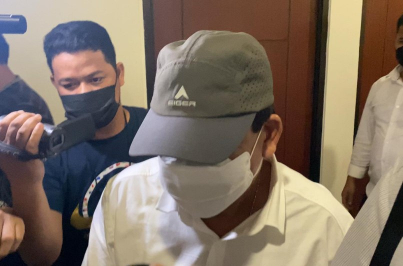 Tampak Syafri Harto mengenakan kemeja putih lengan panjang, topi hijau keabu-abuan, dan masker putih.