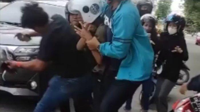 Ia terlihat memegang tangan dan leher remaja laki-laki berbaju hijau. Seorang wanita juga mencoba meminta polisi tersebut untuk melepas temannya.