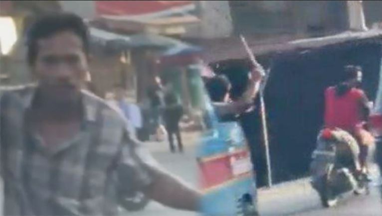 Sopir angkot itu nampak seperti membawa benda diduga parang di tangan kanannya sambil mengacungkan ke arah pengendara lainnya.
