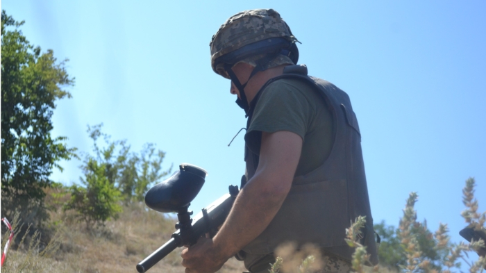 Dalam sebuah laporan terlihat warga sipil yang menjadi sukarelawan pasukan amatir Ukraina terlihat berlatih dengan senapan kayu di sebuah situs bangunan yang telah ditinggalkan.
