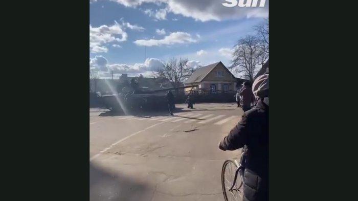 Sebelum berlutut, pria Ukraian itu sempat naik ke tank yang berjalan dan turun untuk berlutut ketika tank Rusia itu mulai menurunkan kecepatannya.