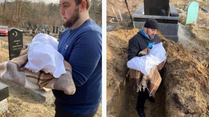 Foto-foto yang menyayat hati menunjukkan bayi yang meninggal di kuburan, terbungkus kain kafan dan digendong oleh seorang pria saat pemakaman berlangsung.