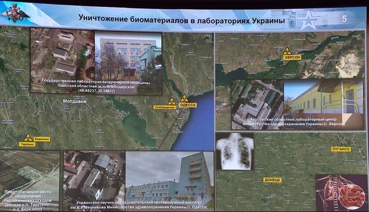 Kirillov menunjukkan dokumen resmi yang mengkonfirmasi transfer 5.000 sampel serum darah yang diambil dari warga Ukraina ke pusat Richard Lugar yang didukung Pentagon di Tbilisi, Georgia. 773 pengujian biologis lainnya dipindahkan ke Inggris, sementara sebuah perjanjian ditandatangani untuk transfer "jumlah tak terbatas" bahan infeksius ke Institut Friedrich Loeffler, pusat penyakit hewan terkemuka di Jerman.