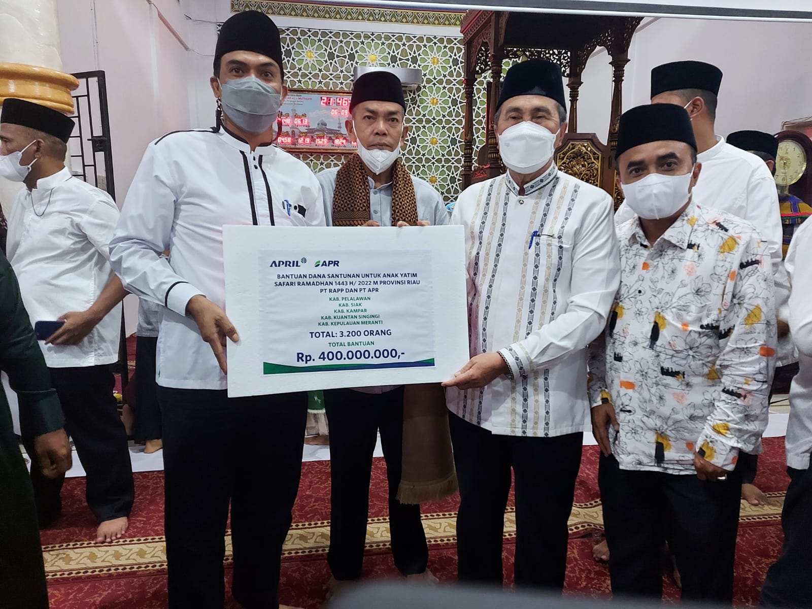 Pada safari Ramadan perdana ini, Gubri didampingi Wakil Bupati Pelalawan, Nasaruddin menyerahkan santunan secara simbolis kepada 3.200 anak yatim bantuan dari PT Riau Andalan Pulp and Paper (RAPP) dan PT Asia Pacific Rayon (APR).