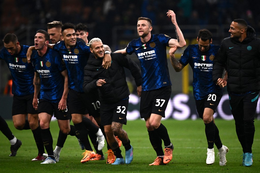 Pemain depan Inter Milan Lautaro Martinez merayakan kemenangan dengan rekan setimnya setelah laga Serie A Italia antara Inter Milan dan AS Roma pada 23 April 2022 di stadion San Siro di Milan.