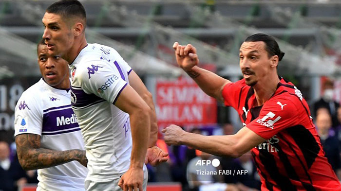 Pemain depan AC Milan Swedia Zlatan Ibrahimovic (kanan) mengejar bek Fiorentina Serbia Nikola Milenkovic (kiri) selama pertandingan sepak bola Serie A antara AC Milan dan Fiorentina di stadion Meazza di Milan pada 1 Mei 2022.