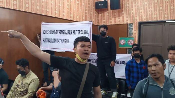 Seorang korban yang terlihat marah dengan menggebu-gebu meneriakkan nada ketidakpuasan, bahkan menyebut adanya permainan antara kuasa hukum dan hakim.