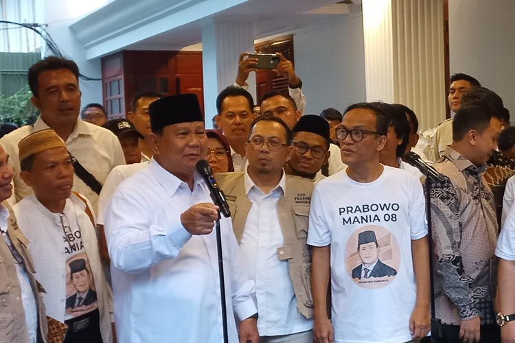 TRIBUNPEKANBARU.COM - Ketua Umum Partai Gerindra Prabowo Subianto menerima kunjungan relawan Jokowi Mania (Joman) yang kini bernama "Prabowo Mania 08" di rumahnya di Jalan Kertanegara, Kebayoran Baru, Jakarta Selatan, Kamis (16/2/2023).