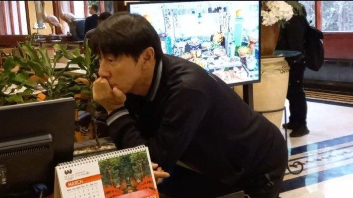 Sambil menunggu sesi wawancara Waketum PSSI, Zainudin Amali selesai, Shin Tae-yong hanya terlihat melamun dengan raut wajah kecewanya di Hotel Sultan, Senayan, Jakarta, Kamis (30/3/2023).