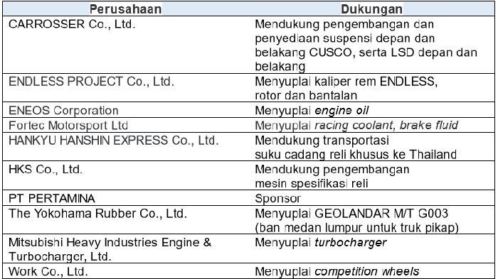"Berdasarkan kekuatan Triton terbaru, performa handling, stabilitas di jalan yang kasar, dan kenyamanan berkendara semakin ditingkatkan sebagai mobil kompetisi reli. Selain itu, turbocharger telah ditingkatkan untuk meningkatkan respons mesin di seluruh rentang putaran mesin mulai dari RPM rendah hingga tinggi, sehingga menghasilkan mobil reli yang tangguh dan mampu menghadapi segala kondisi jalan," ujar Hiroshi Masuoka, Direktur Team Mitsubishi RALLIART.