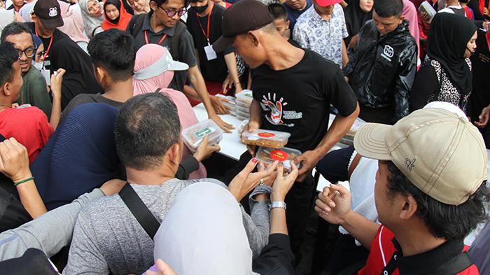 Usai seremonial penyerahan sertifikat MURI diserahkan, ribuan porsi mie sagu goreng yang disusun di atas meja sepanjang 50 meter di depan panggung utama diberikan ke masyarakat.