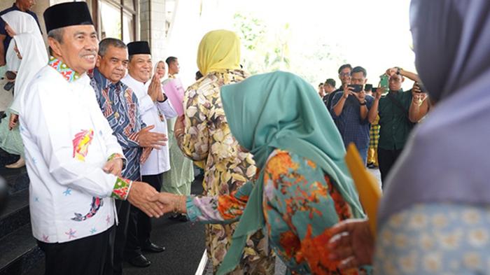 Setelah memberikan kata perpisahan, satu per satu pegawai di lingkungan Kantor Gubernur Riau ini pun bersalaman dengan Gubri Syamsuar.