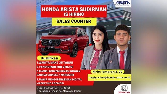 Branch Manager Honda Arista Sudirman Nataly mengatakan, posisi yang dibutuhkan adalah Sales Counter dan bagi yang berminat bisa mengantarkan lamarannya.