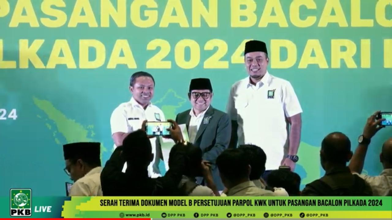 TRIBUNPEKANBARU.COM, PEKANBARU - Pasangan bakal calon (Bacalon) Gubernur Gubernur dan Wakil Gubernur Abdul Wahid - SF Hariyanto resmi menerima Form persetujuan Parpol atau yang biasa disebut B.KWK oleh ketua Umum Muhaimin Iskandar, sebagai syarat untuk mendaftar di Pilgub Riau 2024 ke Komisi Pemilihan Umum (KPU) nantinya.