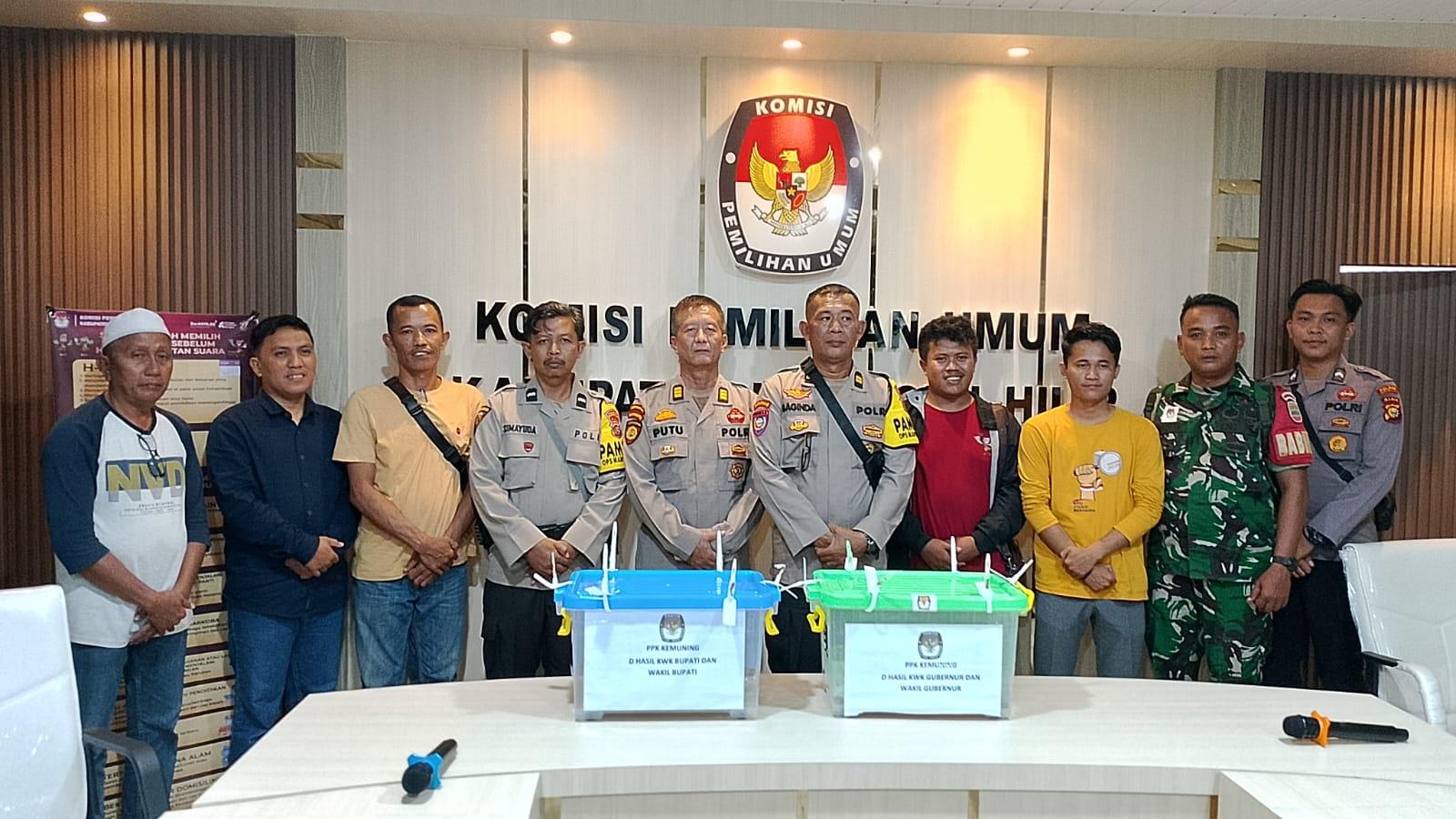 Kapolsek Kemuning KOMPOL A.Raymon Tarigan, S.Sos, MH melalui Kanit Intel Polsek Kemuning AKP Igusti Putu Panji dan personil Polsek Kemuning dan Personil Koramil 09 Selensen mengawal kotak suara, Sabtu (30/11/2024).
