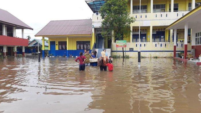 Akses ke sekolah dan halaman sekolah juga tergenang banjir.