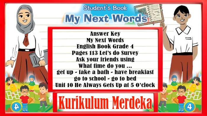 TRIBUNPEKANBARU.COM, PEKANBARU - Here are the answer key for the Grade 4 English on pages 113 Let’s do Survey Ask your friends using What time do you get up - take a bath - have breakfast - go to school - go to bed Unit 10 He Always Gets Up at 5 O’clock semester 2 in the My Next Words textbook SD and MI Merdeka Curriculum edition, published by the Kemendikbudristek, first print, 2021.