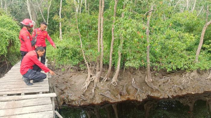 Di bawah sinar matahari yang temaram tertutup awan, lima orang berseragam merah berjalan penuh perhitungan, sesekali berhenti memeriksa semak, mencatat titik koordinat, dan mengukur tinggi muka air.