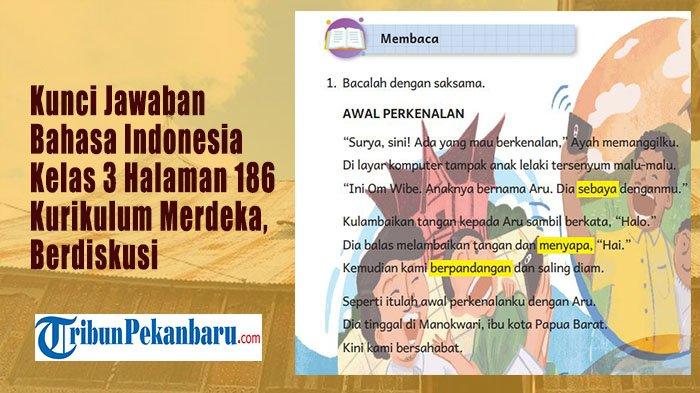TRIBUNPEKANBARU.COM - Sebagai pedoman belajar, inilah Indonesia Kelas 3 Kurikulum Merdeka, Kunci Jawaban Halaman 186: Materi Tugas Berdiskusi!.